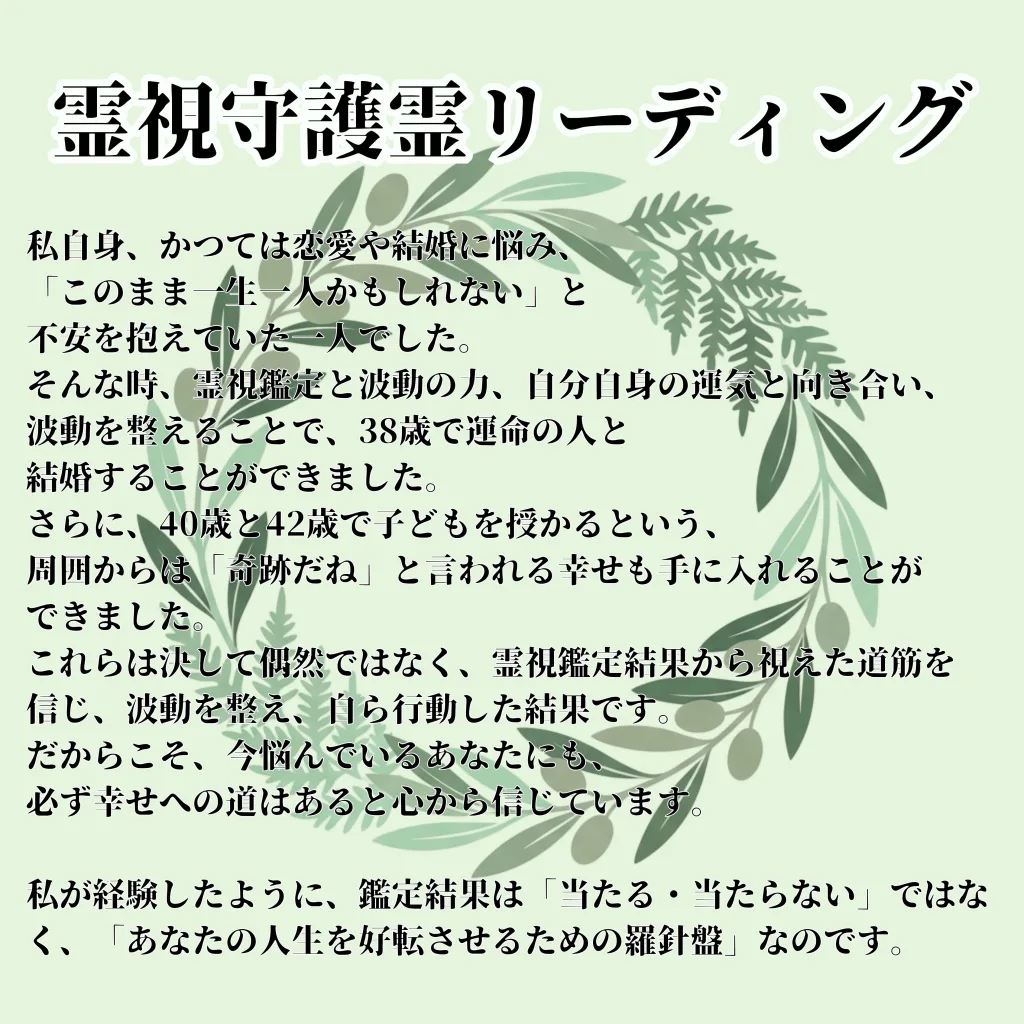 私自身が38歳で結婚、40歳・42歳で出産という「奇跡」を手にしたのも、この霊視鑑定の道しるべがあったからこそです。